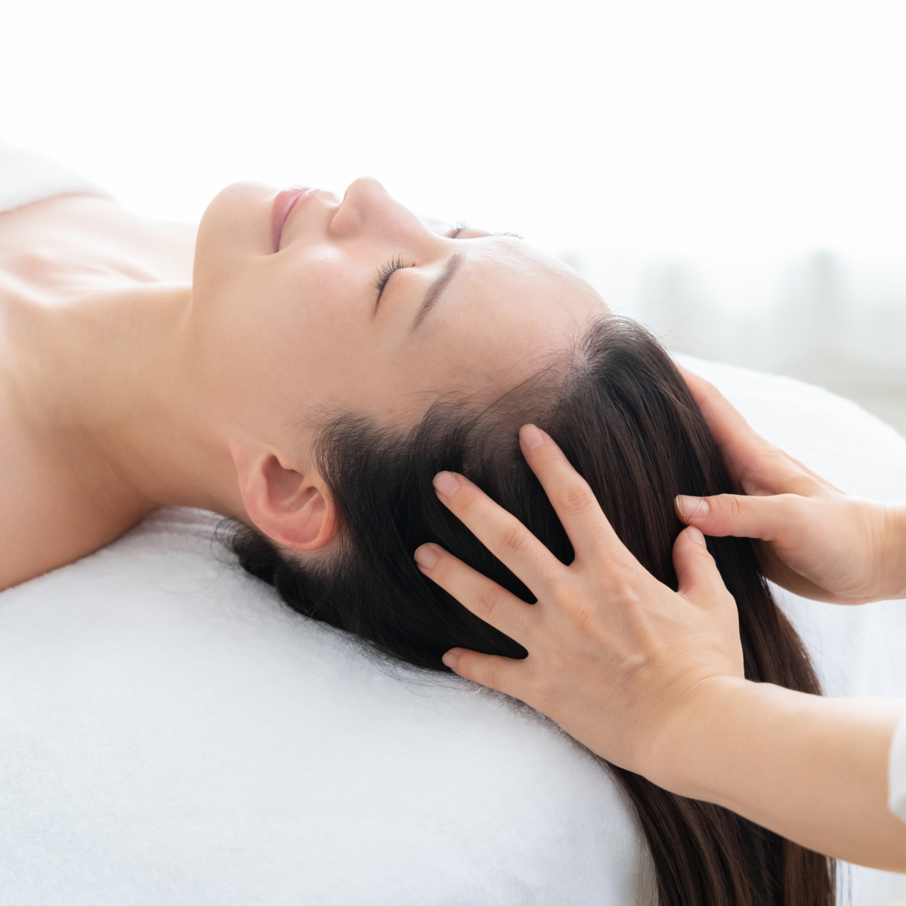 リラクゼーション効果と頭皮の血行促進を兼ね備えた人気メニュー。専用クレンジングジェルとマッサージで、髪の土台から健やかに。男性・女性ともにおすすめです。